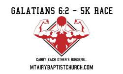 The Galatians 6:2 5K was developed by Mt. Airy Baptist Church and is based on the Bible verse, Galatians 6:2 – "Carry each other's burdens, and in this way you will fulfill the law of Christ." Participants are invited to wear a backpack with written prayer requests of others or a symbol of the prayers of others reminding us of the importance of praying, comforting, and sharing the cares of those around us.